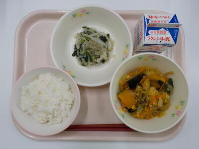 今日の給食は、ごはん、牛乳、かぼちゃのそぼろ煮、ゴマじゃこサラダです。