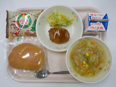 今日の給食は、パーカーハウスパン、牛乳、コンソメスープ、照り焼きチキンパティ、ゆで野菜、クリスマスケーキです。