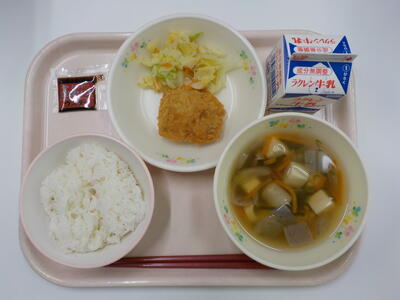 ゆで野菜は、キャベツが新鮮で美味でした。とんかつは、甘いタレとカツがマッチしていました。けんちん汁は、ごぼう、里芋、糸こんにゃくと、いろいろな食材と食感を楽しむことができる、とてもおいしい給食でした。ごちそうさまでした。