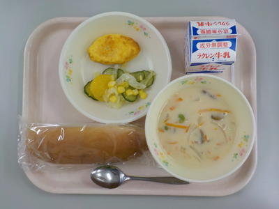 今日の給食は、コーンクリームスープ、トマトオムレツ、フレンチサラダです。