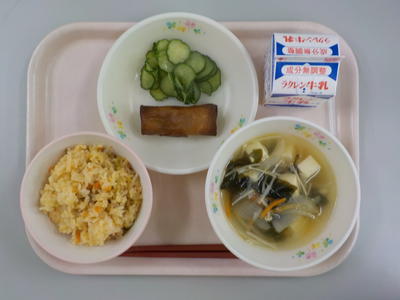 キムチチャーハンのキムチの辛味が丁度よく、中華スープや春巻きとの相性が抜群でした。塩もみきゅうりもさっぱりとしていて、とてもおいしい給食でした。ごちそうさまでした。