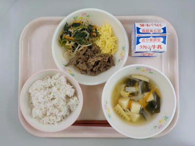 ビビンバの焼肉とナムルと錦糸卵の彩りが美しいのはもちろんのこと味も格別でした。中華スープもビビンバとの相性がよくとてもおいしい給食でした。ごちそうさまでした。