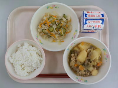 肉じゃがのジャガイモが、ホクホクしていてとても良い味付けでした。また、ゆで干し大根の酢の物もさっぱりしていて、とてもおいしい給食でした。ごちそうさまでした。