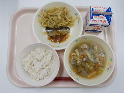 今日の給食は、麦ごはん、牛乳、鶏ごぼう汁、いわしのおかか煮、ごまあえです。