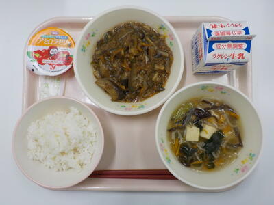 今日の給食は、ごはん、牛乳、春雨スープ、マーボーナス、アセロラゼリーです。