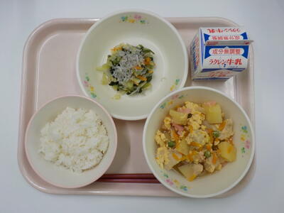 今日の給食は、ごはん、牛乳、親子煮、ごまじゃこサラダです。