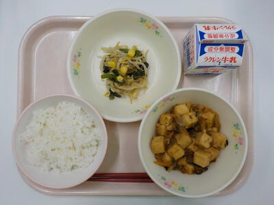 今日の給食は、ご飯、牛乳、マーボー豆腐、ナムルです。