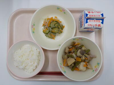 今日の給食は、ごはん、牛乳、筑前煮、きゅうりと春雨の酢の物です。