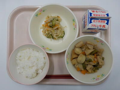 チキンカレーは、子どもたちが一番大好きなメニューで、期待通りの味でした。海藻サラダは、海の香りがするとてもおいしい給食でした。ごちそうさまでした。