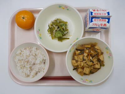 今日の給食は、麦ごはん、牛乳、マーボー豆腐、茎わかめの酢の物、冷凍みかんです。
