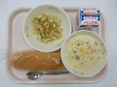 ナッツサラダは、ナッツの歯ごたえがよくサラダの味が引き立っていました。クリームシチューは、まろやかでコクがあり、とてもおいしい給食でした。ごちそうさまでした。