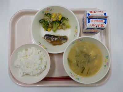 今日の給食は、ごはん、牛乳、じゃがいものみそ汁、イワシの梅煮、ブロッコリーのおひたしです。