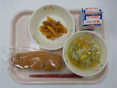 今日の給食は、レーズンパン、牛乳、ジュリアンスープ、ジャーマンポテトです。