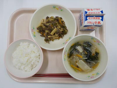 即席漬けは、もやしがシャキシャキとしてさっぱりしていました。五目豆は、だいず、ごうぼう、天ぷらといろいろな味を楽しむことができるとてもおいしい給食でした。ごちそうさまでした。