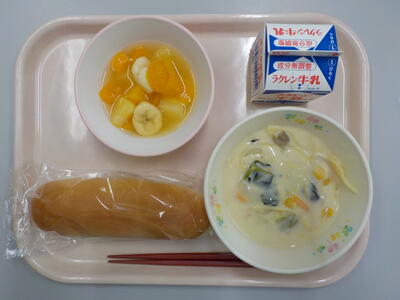 フルーツミックスは、みかんやバナナなどいろんな味を楽しむことができました。スープスパゲッティは、麺の硬さが丁度良くクリーミーで、とてもおいしい給食でした。ごちそうさまでした。