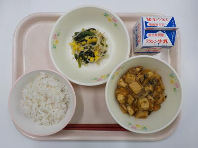 今日の給食は、麦ごはん、牛乳、マーボー豆腐、ナムルです。