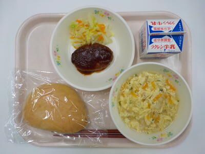 今日の給食は、パーカーハウスパン、牛乳、ゆで野菜、ポテトと卵のスープ、ハンバーグです。ゆで野菜とハンバーグをパーカーハウスパンにはさむと自家製のハンバーガーができあがるので、楽しみながら食べることができました。ポテトと卵のスープは、ポテトがやわらかく、とてもおいしい給食でした。ごちそうさまでした。