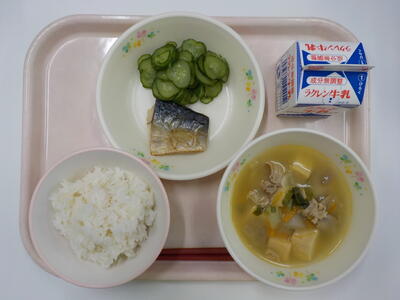 今日の給食は、ごはん、牛乳、豚汁、さばの塩焼き、塩もみきゅうりです。