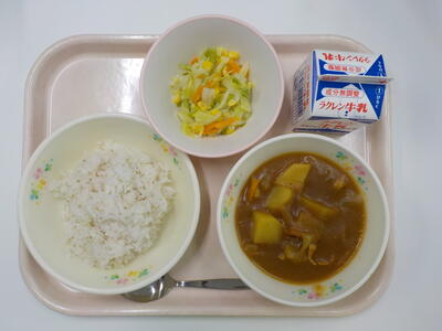 今日の給食は、チキンカレー、牛乳、コールスローサラダです。